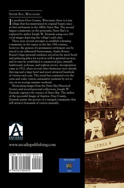 In northern Door County, Wisconsin, there is a tiny village that has maintained its original beauty since its first settlement in the 1860s: Sister Bay. The second largest community on the peninsula, Sister Bay's is explored by author Joseph W. Zurawski using over 200 vivid images depicting the village's early days. There were several attempts to establish a farming community in the region in the late 19th century, however, the genesis of a permanent settlement can be traced to an influential businessman, Andre Roeser. Roeser's large personal residence served as the area's hotel and gathering place for social as well as spiritual services, and in time he established a commercial pier, sawmill, lumberyard, icehouse, and tugboat service. Incorporation came in 1912, when several other businesses were already thriving and a large hotel and resort attracted hundreds of visitors each year. This trend has continued over the years and today visitors outnumber residents by ten to one on an average summer weekend.