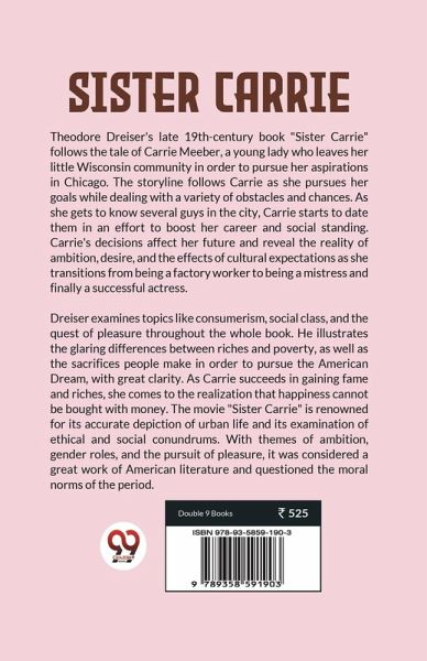 Theodore Dreiser's late 19th-century book "Sister Carrie" follows the tale of Carrie Meeber, a young lady who leaves her little Wisconsin community in order to pursue her aspirations in Chicago. The storyline follows Carrie as she pursues her goals while dealing with a variety of obstacles and chances. As she gets to know several guys in the city, Carrie starts to date them in an effort to boost her career and social standing. Carrie's decisions affect her future and reveal the reality of ambition, desire, and the effects of cultural expectations as she transitions from being a factory worker to being a mistress and finally a successful actress. Dreiser examines topics like consumerism, social class, and the quest of pleasure throughout the whole book. He illustrates the glaring differences between riches and poverty, as well as the sacrifices people make in order to pursue the American Dream, with great clarity. As Carrie succeeds in gaining fame and riches, she comes to the realization that happiness cannot be bought with money. The movie "Sister Carrie" is renowned for its accurate depiction of urban life and its examination of ethical and social conundrums. With themes of ambition, gender roles, and the pursuit of pleasure, it was considered a great work of American literature and questioned the moral norms of the period.