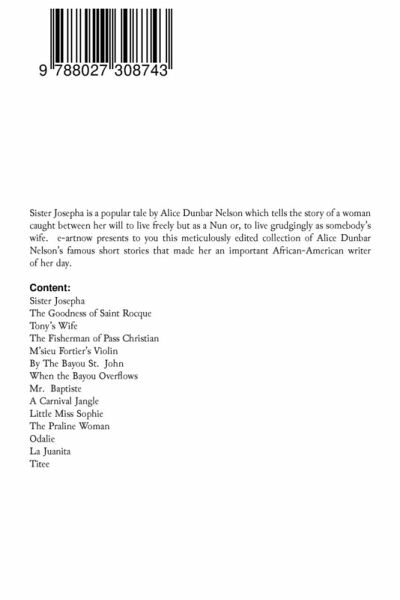 Sister Josepha is a popular tale by Alice Dunbar Nelson which tells the story of a woman caught between her will to live freely but as a Nun or, to live grudgingly as somebody's wife. e-artnow presents to you this meticulously edited collection of Alice Dunbar Nelson's famous short stories that made her an important African-American writer of her day. Content: - Sister Josepha - The Goodness of Saint Rocque - Tony's Wife - The Fisherman of Pass Christian - M'sieu Fortier's Violin - By The Bayou St. John - When the Bayou Overflows - Mr. Baptiste - A Carnival Jangle - Little Miss Sophie - The Praline Woman - Odalie - La Juanita - Titee