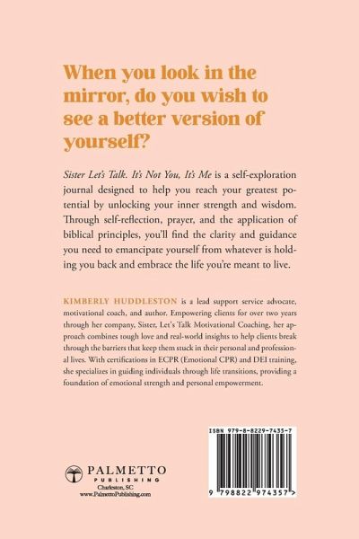 Tap into the transformative power of God's Word and tell the world WHO YOU ARE in this inspiring journal of self-exploration. Taking accountability is hard. While not everything that goes wrong in our life is our fault, the sooner we start to love ourselves and take responsibility, the sooner we can begin to heal. Sister Let's Talk. It's Not You, It's Me is a self-exploration journal designed to help us get unstuck by identifying the powerful tools that already exist within us. It's about unlocking our inner strength and wisdom, while integrating the transformative power of God's Word into key areas of our life. A guide to self-discovery, healing, and personal and professional growth, this collection of encouraging scriptures, motivating affirmations, and inspiring quotes prompts us to pick up our pens and discover who we are. Motivational coach Kimberly Huddleston challenges us to reframe our thinking, reminding us to rely on our faith and resourcefulness to overcome life's obstacles and leap into our full potential. By reflecting, praying, and applying biblical principles, we'll find the clarity and direction needed to break free from what's holding us back and embrace the life we're meant to live. Women from all walks of life will enjoy embarking on this journey of self-discovery and healing from the inside out.