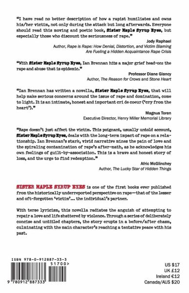 Sister Maple Syrup Eyes is one of the first books published from the historically under-reported perspective on rape: from that of the lesser and oft-forgotten "other victim," the individual's partner. With terse lyricism, this novella radiates the anguish of attempting to repair a love and life shattered by violence. Through a series of deliberately concise and untitled chapters, the story erupts in a before/after chasm, culminating with the main character's facing a tentative peace with his past.