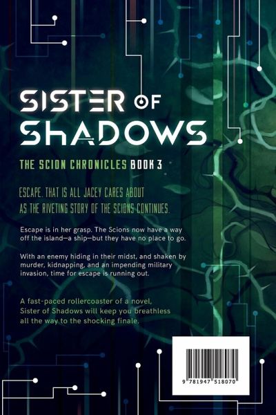 Evil lurks among the Scions, waiting its moment to strike! Sister of Shadows is the third book in The Scion Chronicles. When a daring escape costs a beloved Scion's life, Jacey races alone into the outside world for help . . . and comes face to face with ghosts from her past. As suspicion casts its shadow, Jacey's friends become foes and old enemies become her only allies. Author Eric Kent Edstrom returns to the world of the Scions, bringing more of his trademark thriller pacing, shocking twists, and unique humor.