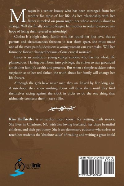 Meagan is a senior beauty who has been estranged from her mother for most of her life. As her relationship with her father is rocked on prom night, her whole world is about to change. Will she finally learn to forgive her mother in order to restore any hope of fixing their severed relationship? Christa is a high school junior who has found her first love. But as parents and circumstances threaten to tear them apart, she must make one of the most painful decisions a young woman can ever make. Will her future be forever changed because of one crucial mistake? Laney is an ambitious young college student who has her whole life planned out. Having been born into privilege, she strives to stay grounded amidst her family's wealth and pretense. But when a simple accident raises suspicion as to her real father, the truth about her family will change her life forever. Although the girls have never met, they are linked by fate long ago. A sisterhood they know nothing about will drive them until they find themselves racing against the clock in order to do the one thing that ultimately connects them - save a life.