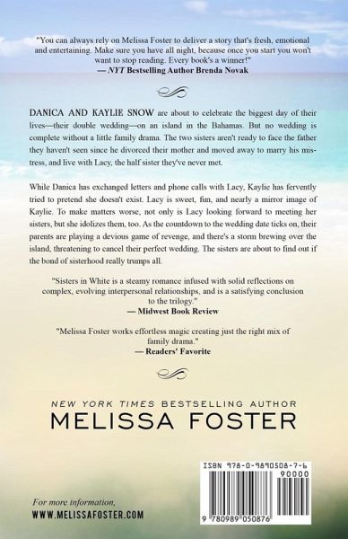 Discover the magic of New York Times bestseller Melissa Foster's writing, and see why millions of readers have fallen in love with The Love in Bloom Series. In SISTERS IN WHITE... Danica and Kaylie Snow are about to celebrate the biggest day of their lives--their double wedding--on an island in the Bahamas. But no wedding is complete without a little family drama. The two sisters aren't ready to face the father they haven't seen since he divorced their mother and moved away to marry his mistress, and live with Lacy, the half sister they've never met. While Danica has exchanged letters and phone calls with Lacy, Kaylie has fervently tried to pretend she doesn't exist. Lacy is sweet, fun, and nearly a mirror image of Kaylie. To make matters worse, not only is Lacy looking forward to meeting her sisters, but she idolizes them, too. As the countdown to the wedding date ticks on, their parents are playing a devious game of revenge, and there's a storm brewing over the island, threatening to cancel their perfect wedding. The sisters are about to find out if the bond of sisterhood really trumps all. *** WANT MORE LOVE IN BLOOM? Follow Max and Treat's love story in LOVERS AT HEART, REIMAGINED. All Love in Bloom books can be read as stand-alone novels or as part of the series: THE BRADENS (Weston, CO) Lovers at Heart, Reimagined (Treat & Max) Destined for Love (Rex & Jade) Friendship on Fire (Josh & Riley) Sea of Love (Dane & Lacy) Bursting with Love (Savannah & Jack) Hearts at Play (Hugh & Bree) ** All Love in Bloom novels are written to stand alone without any unresolved issues or cliffhangers. Love in Bloom features alpha male heroes and sexy, empowered women. They're flawed, funny, passionate, and relatable to readers who enjoy contemporary romance and women's fiction. Characters from each sub-series appear in future books. Love In Bloom Series Snow Sisters The Bradens at Weston The Bradens at Trusty The Bradens at Peaceful Harbor The Bradens & The Montgomerys (Pleasant Hill - Oak Falls) The Remingtons The Ryders Seaside Summers Bayside Summers Wild Billionaires After Dark Bad Billionaires After Dark Harborside Nights The Whiskeys & Tru Blue The Wickeds