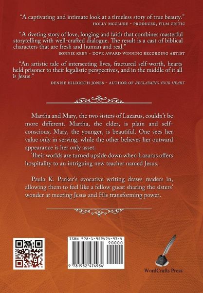 Martha and Mary, the two sisters of Lazarus, couldn't be more different. Martha, the elder, is plain and self-conscious; Mary, the younger, is beautiful. One sees her value only in serving, while the other believes her outward appearance is her only asset. Their worlds are turned upside down when Lazarus offers hospitality to an intriguing new teacher named Jesus. Paula K. Parker's evocative writing draws readers in, allowing them to feel like a fellow guest sharing the sisters' wonder at meeting Jesus and his transforming power.