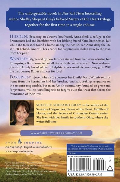 The unforgettable novels in New York Times bestselling author Shelley Shepard Gray’s beloved Sisters of the Heart trilogy, together for the first time in a single volume Hidden: Escaping an abusive boyfriend, Anna finds a refuge at the Brenneman Bed and Breakfast with her lifelong friend Katie Brenneman. But while she feels she’s found a home among the Amish, can Anna deny the life she left behind? And will her chance for happiness be stolen away by the man from her past? Wanted: Frightened by how far she’s strayed from her values during her Rumspringa, Katie vows to cut all ties with the outside world. Now widower Jonathan Lundy has asked her to help him take care of his two young girls. Will the past destroy Katie’s chances for love? Forgiven: Injured when a fire destroys her family’s barn, Winnie returns home from the hospital to find her brother, Jonathan, seeking vengeance on the arsonist responsible. But in an Amish community founded on grace and forgiveness, will his unwillingness to forgive ruin the trust that forms the foundation of their lives?