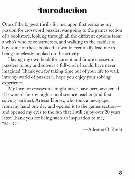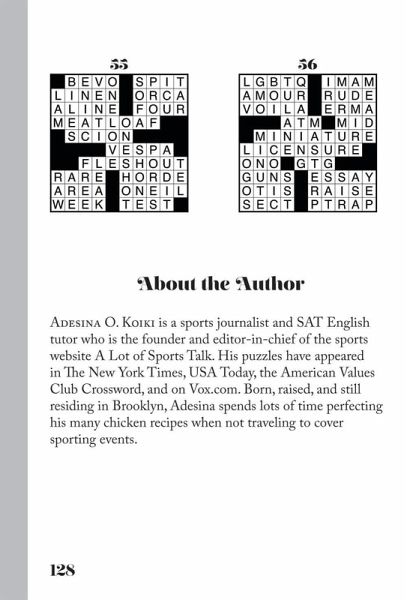 Adesina O. Koiki is the creator of the podcast A Lot of Sports Talk and has worked in all facets of sports journalism, including as a reporter/researcher at ESPN The Magazine. He has constructed crosswords for The New York Times and the American Values Club Crossword, and he constructs mini crosswords regularly for Vox.com. He is a native of Brooklyn, New York.