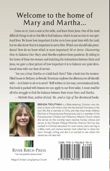 Welcome to the home of Mary and Martha... Come on in, have a seat at the table, and learn from Jesus. One of the most difficult things to do in this life is find balance, which is just as true in our spiritual lives. We know how important it is for us to have quiet time with the Lord, but we also know that it is important to serve Him. Which one should take precedence? How do we know which is more important? Sit or Serve: Discovering How to Balance Our Mary and Martha explores these questions. By sitting in the home of these two women and watching the interactions between them and Jesus, we gain a clear picture of how important it is to balance our quiet devotional time with our time of service. "Are you a busy Martha or a laid-back Mary? Take a look into the tension-filled house in Bethany as Brenda Troutman explores the dilemma we all identify with-is it better to sit or to serve? Well written in her easy, conversational style, this book is packed with lessons we can apply to our lives today. A must-read for all who struggle to find the balance between their inner Mary and Martha." -Michele Huey, author of God, Me, and a Cup of Tea devotional books