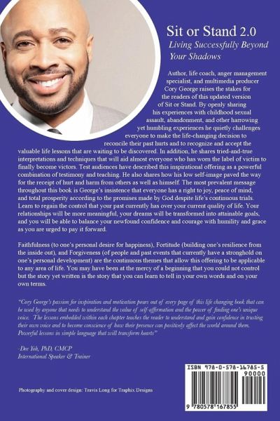 Neither childhood sexual assault, a seemingly debilitating speech impediment, bullying, or bearing witness to drug and alcohol addiction within his family resulted in total defeat for the author of this gripping and frankly transparent literary offering that combines the power of testimony with carefully crafted lessons. Author, speaker, and coach practitioner, Cory George, raises the stakes for the reader to make the life-changing decision to reconcile their past hurts and to recognize and accept the valuable life lessons that will ultimately lead to better life choices. If you are tired of SITTING and continually accepting consequences related to past decisions and stuck in a continuous loop of pain, negative consequences based on bad choices, and wondering how to make sense of it all then Sit or Stand 2.0 offers, from a coach's perspective, a playbook of tried-and-true techniques that will assist you in four critical areas of situation resolution: Acceptance, Forgiveness, Reconciliation, and Retention and Application of Wisdom. In addition, you will come to further understand how pain, adversity, and trials can be transformed into PURPOSE and PASSION. This highly-relatable and highly-palatable "problem resolution guide" helps to build confidence and effective communication skills by stressing the importance of understanding who you are before you are able to translate your desires to others. In addition, lessons in understanding and creating realistic expectations and understanding the importance of a healthy support system allows the reader the opportunity to fortify themselves from the outside. Finally, George empowers the reader by making clear that we all have the ability to positively affect the life of someone else. You are taught how to give positive value to every adversity that you will overcome. Your current and future relationships will become more meaningful and intentional. Your dreams will be transformed into realistic and attainable goals, and you will be able to balance confidence and courage with humility and grace as you are urged to pay it forward. You are challenged to find the courage to not only break the chains of a hostile past but to also walk into a life whereby more positive chances are taken and, in return, share the lessons of faith, reconciliation, and excellence with someone else.
