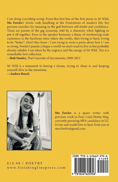 I am doing everything wrong. From this first line of the first poem in Sit Wild, Mo Fowler's words rush headlong at the frustrations of modern life; her persona searches for meaning in the gulf between self-doubt and confidence. These are poems of the gig economy, told by a character who's fighting to put it all together. Even as the speaker bemoans a litany of overbearing male customers in the hardware store where she works, she's trying so hard, trying to be "better": Don't they know / I am trying to write a poem about how I / am so strong. Fowler's poems critique a world we don't want to live in but probably already inhabit. I am taken by the urgency and the energy of Sit Wild. This is a remarkable first collection. -Bob Stanley, Poet Laureate of Sacramento, 2009-2012 Sit Wild is a testament to having a dream, trying to chase it, and keeping yourself alive in the meantime. -Andrea Busch