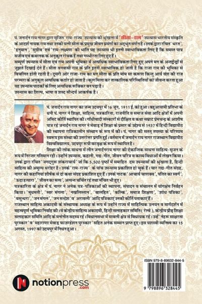 The novel Sita-Ram is one of the novels in the series of novels title Ram - Rajya written by Pdt. Janardan Rai Nagar. This novel wonderfully depicts the major episodes of the life of Ram, the epitome of Indian Culture and his wife Sita. Like his other novels in the series namely "Bharat", " Hanuman", "Sugreev" and "Ram-Lakshman", this novel also brings alive the plot and characters which makes it interesting and endowed with serenity. In the entire novel the characters of Ram and Sita in their natural roles seem to engage in a struggle with the dilemmas of their inner selves. Sita gets so much attuned to Ram's personality of exile that she feels disturbed to see Ram in the robe of a King. On the other hand the heart of Ram is as soft as wax towards Sita but it becomes exceptionally hard in the pursuit of observing the traditions of the Arya dynasty.In totality the novel brings to life the situations of that time and makes it an interesting reading. The language, craft and the imagery of the novel are attractive.