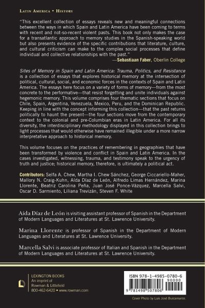 Sites of Memory in Spain and Latin America is a collection of essays that explores historical memory at the intersection of political, cultural, social, and economic forces in the contexts of Spain and Latin America. The essays here focus on a variety of forms of memory-from the most concrete to the performative-that resist forgetting and unite individuals against hegemonic memory. The volume comprises four thematic sections that focus on Chile, Spain, Argentina, Venezuela, Mexico, Peru, and the Dominican Republic. Keeping in line with the concept informing this collection, that the past returns politically to haunt the present, the four sections move from the contemporary context to the colonial and pre-Columbian eras in Latin America. For all its diversity, the researchers' interdisciplinary methodology displayed in this collection brings to light processes that would otherwise have remained illegible under a more narrow interpretative approach to historical memory. This volume focuses on the processes of remembering in geographies that have been transformed by violence and conflict in Spain and Latin America. In the cases investigated witnessing, trauma, and testimony speak to the urgency of truth and justice; historical memory, therefore, is ultimately a political act.