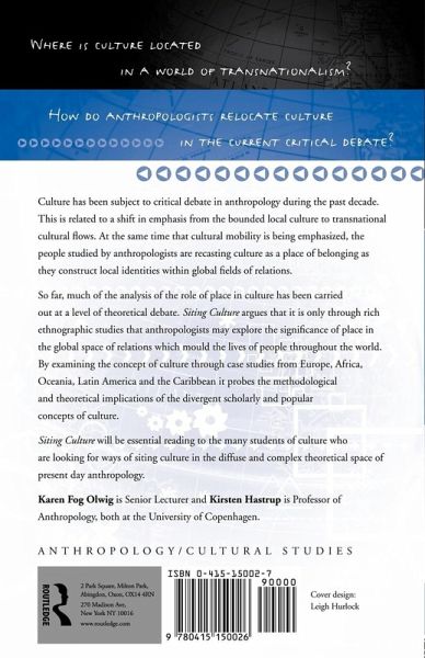 Culture has been subject to critical debate in anthropology during the past decade and this is related to a shift in emphasis from the bounded local culture to transnational cultural flows. At the same time that cultural mobility is being emphasized, the people studied by anthropologists are recasting culture as a place of belonging as they construct local identities within global fields of relations. So far, much of the analysis of the role of place in culture has been carried out at a level of theoretical debate. Siting Culture argues that it is only through rich ethnographic studies that anthropologists may explore the significance of place in the global space of relations which mould the lives of people throughout the world. By examining the concept of culture through case studies from Europe, Africa, Oceania, Latin America and the Caribbean it probes the methodological and theoretical implications of the divergent scholarly and popular concepts of culture.