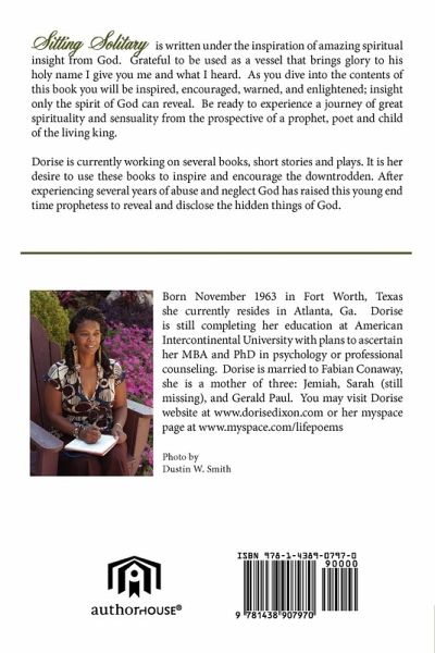 Sitting Solitary is written under the inspiration of amazing spiritual insight from God. Grateful to be used as a vessel that brings glory to his holy name I give you me and what I heard. As you dive into the contents of this book you will be inspired, encouraged, warned, and enlightened; insight only the spirit of God can reveal. Be ready to experience a journey of great spirituality and sensuality from the prospective of a prophet, poet and child of the living king.