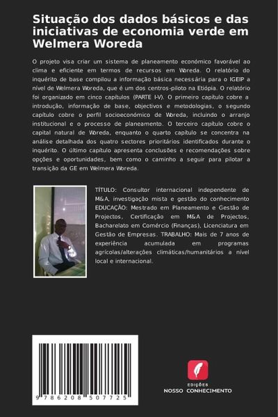 O projeto visa criar um sistema de planeamento económico favorável ao clima e eficiente em termos de recursos em Woreda. O relatório do inquérito de base compilou a informação básica necessária para o IGEIP a nível de Welmera Woreda, que é um dos centros-piloto na Etiópia. O relatório foi organizado em cinco capítulos (PARTE I-V). O primeiro capítulo cobre a introdução, informação de base, objectivos e metodologias, o segundo capítulo cobre o perfil socioeconómico de Woreda, incluindo o arranjo institucional e o processo de planeamento. O terceiro capítulo cobre o capital natural de Woreda, enquanto o quarto capítulo se concentra na análise detalhada dos quatro sectores prioritários identificados durante o inquérito. O último capítulo apresenta conclusões e recomendações sobre opções e oportunidades, bem como o caminho a seguir para pilotar a transição da GE em Welmera Woreda.