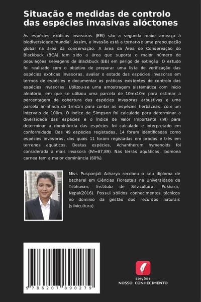 As espécies exóticas invasoras (EEI) são a segunda maior ameaça à biodiversidade mundial. Assim, a invasão está a tornar-se uma preocupação global na área da conservação. A área da Área de Conservação do Blackbuck (BCA) tem sido a área que suporta o maior número de populações selvagens de Blackbuck (BB) em perigo de extinção. O estudo foi realizado com o objetivo de preparar uma lista de verificação das espécies exóticas invasoras, avaliar o estado das espécies invasoras em termos de espécies e documentar as práticas existentes de controlo das espécies invasoras. Utilizou-se uma amostragem sistemática com início aleatório, em que se utilizou uma parcela de 10mx10m para estimar a percentagem de cobertura das espécies invasoras arbustivas e uma parcela aninhada de 1mx1m para contar as espécies herbáceas, com um intervalo de 100m. O Índice de Simpson foi calculado para determinar a diversidade das espécies e o Índice de Valor Importante (IVI) para determinar a dominância das espécies foi calculado e interpretado em conformidade. Das 49 espécies registadas, 14 foram identificadas como espécies invasoras, das quais 11 foram registadas em prados e três em terrenos aquáticos. Destas espécies, Achantherum hymenoids foi considerada a mais invasora (IVI=87,89). Nas terras aquáticas, Ipomoea carnea tem a maior dominância (60%).