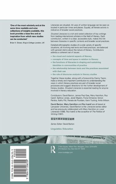 List of figures List of tables List of contributors Foreword by Denny Taylor Introduction: exploring situated literacies 1 Literacy practices 2 Expanding the new literacy studies: using photographs to explore literacy as social practice 3 The new literacy studies and time: an exploration 4 There is no escape from third-space theory: borderland discourse and the 'in-between' literacies of prisons 5 Becoming just another alphanumeric code: farmers' encounters with the literacy and discourse practices of agricultural bureaucracy at the livestock auction 6 Texts in practices: interpreting the physical characteristics of children's project work 7 Family literacy: a pedagogy for the future? 8 Emergent literacy practices in an electronic community 9 Respect and the pursuit of 'symmetry' in researching literacy and student writing 10 Researching literacy practices: learning from activities with teachers and students 11 The New Literacy Studies: from 'socially situated' to the work of the social 12 The New Literacy Studies: context intertextuality and discourse 13 New Literacy Studies at the Interchange Index