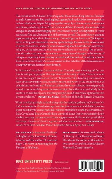 The contributors to Situation Critical argue for the continued importance of critique to early American studies, pushing back against both reductivist neo-empiricism and so-called postcritique. Bringing together essays by a diverse group of historians and literary scholars, editors Max Cavitch and Brian Connolly demonstrate that critique is about acknowledging that we are never simply writing better or worse accounts of the past, but accounts of the present as well. The contributors examine topics ranging from the indeterminacy of knowledge and history to Black speculative writing and nineteenth-century epistemology, the role of the unconscious in settler colonialism, and early American writing about masturbation, repression, religion, and secularism and their respective influence on morality. The contributors also offer vital new interpretations of major lines of thought in the history of critique-especially those relating to Freud and Foucault-that will be valuable both for scholars of early American studies and for scholars of the humanities and interpretive social sciences more broadly. Contributors. Max Cavitch, Brian Connolly, Matthew Crow, John J. Garcia, Christopher Looby, Michael Meranze, Mark J. Miller, Justine S. Murison, Britt Rusert, Ana Schwartz, Joan W. Scott, Jordan Alexander Stein