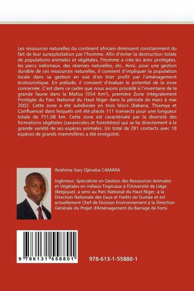 Les ressources naturelles du continent africain diminuent constamment du fait de leur surexploitation par l'homme. Afin d'éviter la destruction totale de populations animales et végétales, l'Homme a crée les aires protégées, les parcs nationaux, des réserves naturelles, etc. Ainsi, pour une gestion durable de ces ressources naturelles, il convient d'impliquer la population locale dans sa gestion en vue d'en tirer profit par l'aménagement écotouristique. En prélude, il convient d'évaluer le potentiel de la zone concernée. C'est dans ce cadre que nous avons procédé à l'inventaire de la grande faune dans la Mafou (554 Km²), première Zone Intégralement Protégée du Parc National du Haut Niger dans la période de mars à mai 2002. Cette zone a été subdivisée en trois blocs (Bakaria, Thiamya et Confluence) dans lesquels ont été placés 111 transects pour une longueur totale de 751,08 km. Cette zone est caractérisée par la diversité des formations végétales (savanicoles et forestières) qui se lie directement à la grande variété de ses espèces animales. Un total de 281 contacts avec 18 espèces de grands mammifères a été enrégistré.
