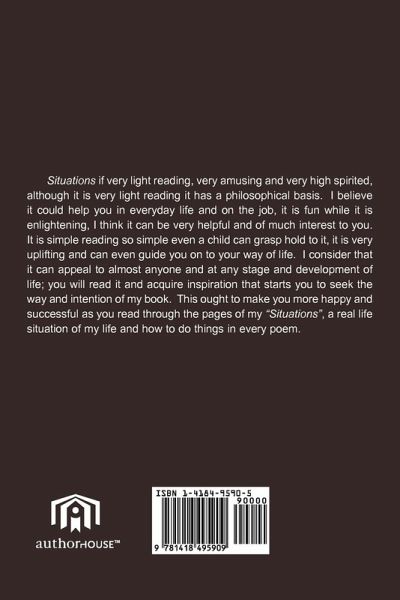 Situations if very light reading, very amusing and very high spirited, although it is very light reading it has a philosophical basis. I believe it could help you in everyday life and on the job, it is fun while it is enlightening, I think it can be very helpful and of much interest to you. It is simple reading so simple even a child can grasp hold to it, it is very uplifting and can even guide you on to your way of life. I consider that it can appeal to almost anyone and at any stage and development of life; you will read it and acquire inspiration that starts you to seek the way and intention of my book. This ought to make you more happy and successful as you read through the pages of my "Situations", a real life situation of my life and how to do things in every poem.