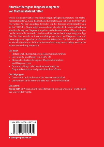 JessicaHoth analysiert die situationsbezogene Diagnosekompetenz vonMathematiklehrkräften, d.h. die diagnostische Kompetenz, die während desUnterrichts relevant ist. Auf der Grundlage der Daten von 133Primarstufenlehrkräften, die an der TEDS-FU-Studie teilgenommen haben,beschreibt die Autorin Merkmale situationsbezogener Diagnosekompetenz undrekonstruiert zwei Diagnosetypen: den fachnahen-bewertenden und denschülernahen-handlungsbezogenen Typ. Darüber hinaus stellt sie Zusammenhängezwischen den Diagnosetypen und deren zugrunde liegendem professionellen Wissenher. Die Arbeit knüpft damit an aktuelle Studien zur Lehrerprofessionsforschungan und belegt Ansätze der Expertiseforschung empirisch.