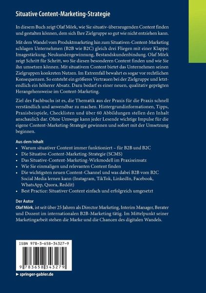 Was ist Situatives-Content-Marketing (SCM)?.- Warum situativer Content immer funktioniert.- Die Situative-Content-Marketing-Strategie (SCMS) für B2B und B2C.- Ziele der SCMS (Situative-Content-Marketing-Strategie).- Das Situative-Content-Marketing-Wirkmodell im Praxiseinsatz.- Bewährte Wege für einmaligen und relevanten Content.- Die wichtigsten situativen Content-Channel (Instagram, TikTok, LinkedIn, Facebook, WhatsApp, The new Kids on the Block, Quora, Reddit).- Best Practice: Situativer Content einfach und erfolgreich umgesetzt.- Umstände, die in Zukunft den Content bei B2B und B2C massiv beeinflussen.- Ausblick und die Situative-Content-Marketing-Strategie im Jahr 2030.