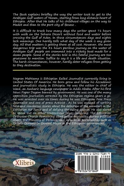 The Book explains briefley the way the writer took to get to the Arabiyan Gulf waters of Yemen, starting from long distance heart of Ethiopia. .After that He talks of his childhood villages on the way to Madot and then to the port city of Bosaso . It is difficult to track how many days the writer spent 71 hours with wolk on the Sehara Desert without food and water before crossing the Gulf of Aden. In those circumstances days and nights lack meanings. One hardly tells what day of the week is any given day. All that matters is getting there at all cost. However, the most dangerous trip was the 41 hours perilous journey on the water of Arebiyan Gulf. people are crammed into a rickety boat made for a dozen people. Some of the stories told in this fateful journey are too gruesome to mention. Suffice to say it is a life and death situation. The harsh circumstances, however, hardly deter refugees from getting to they destination.