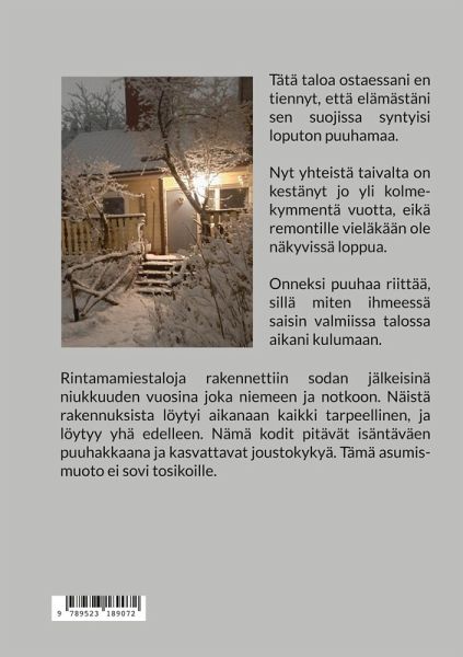 Taloa ostaessani en tiennyt, että elämästäni siinä, tai oikeastaan sen kanssa, syntyisi loputon puuhamaa. Nyt yhteistä taivalta on kestänyt yli kolmekymmentä vuotta, eikä remontille vieläkään häämötä loppua. Onneksi näin, sillä mitä ihmettä minä valmiissa talossa enää puuhailisin. Rintamamiestaloja rakennettiin sodan jälkeisinä niukkuuden vuosina joka niemeen ja notkoon. Näistä rakennuksista löytyi aikanaan kaikki tarpeellinen... ja löytyy yhä. Nämä kodit pitävät isäntäväen puuhakkaana ja kasvattavat joustokykyä. Asumismuoto ei sovi tosikoille.