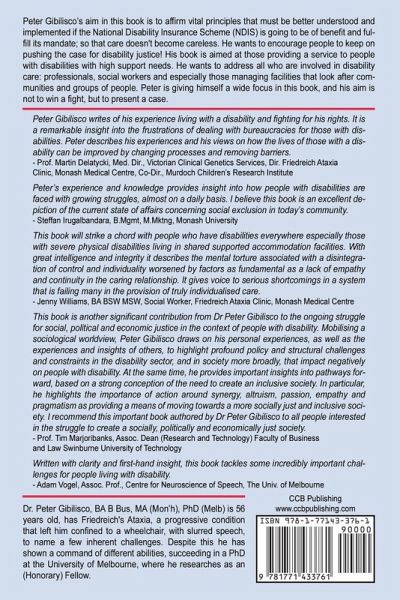Peter Gibilisco's aim in this book is to affirm vital principles that must be better understood and implemented if the National Disability Insurance Scheme (NDIS) is going to be of benefit and fulfill its mandate; so that care doesn't become careless. He wants to encourage people to keep on pushing the case for disability justice! His book is aimed at those providing a service to people with disabilities with high support needs. He wants to address all who are involved in disability care: professionals, social workers and especially those managing facilities that look after communities and groups of people. Peter is giving himself a wide focus in this book, and his aim is not to win a fight, but to present a case. Professional Reviews: "Peter Gibilisco writes of his experience living with a disability and fighting for his rights. It is a remarkable insight into the frustrations of dealing with bureaucracies for those with disabilities. Peter describes his experiences and his views on how the lives of those with a disability can be improved by changing processes and removing barriers." - Prof. Martin Delatycki, Med. Dir., Victorian Clinical Genetics Services, Dir. Friedreich Ataxia Clinic, Monash Medical Centre, Co-Dir., Murdoch Children's Research Institute "This book will strike a chord with people who have disabilities everywhere, especially those with severe physical disabilities living in shared supported accommodation facilities. With great intelligence and integrity it describes the mental torture associated with a disintegration of control and individuality worsened by factors as fundamental as a lack of empathy and continuity in the caring relationship. It gives voice to serious shortcomings in a system that is failing many in the provision of truly individualised care." - Jenny Williams, BA BSW MSW, Social Worker, Friedreich Ataxia Clinic, Monash Medical Centre "This book is another significant contribution from Dr Peter Gibilisco to the ongoing struggle for social, political and economic justice in the context of people with disability. Mobilising a sociological worldview, Peter Gibilisco draws on his personal experiences, as well as the experiences and insights of others, to highlight profound policy and structural challenges and constraints in the disability sector, and in society more broadly, that impact negatively on people with disability. At the same time, he provides important insights into pathways forward, based on a strong conception of the need to create an inclusive society. In particular, he highlights the importance of action around synergy, altruism, passion, empathy and pragmatism as providing a means of moving towards a more socially just and inclusive society. I recommend this important book authored by Dr Peter Gibilisco to all people interested in the struggle to create a socially, politically and economically just society." - Prof. Tim Marjoribanks, Assoc. Dean (Research and Technology) Faculty of Business and Law Swinburne University of Technology "Written with clarity and first-hand insight, this book tackles some incredibly important challenges for people living with disability. - Adam Vogel, Assoc. Prof., Centre for Neuroscience of Speech, The Univ. of Melbourne About the Author: Dr. Peter Gibilisco, BA B Bus, MA (Mon'h), PhD (Melb) is 56 years old, has Friedreich's Ataxia, a progressive condition that left him confined to a wheelchair, with slurred speech, to name a few inherent challenges. Despite this he has shown a command of different abilities, succeeding in a PhD at the University of Melbourne, where he researches as an (Honorary) Fellow.