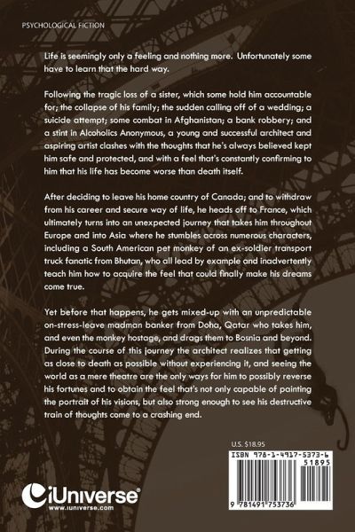 Life is seemingly only a feeling and nothing more. Unfortunately some have to learn that the hard way. Following the tragic loss of a sister, which some hold him accountable for; the collapse of his family; the sudden calling off of a wedding; a suicide attempt; some combat in Afghanistan; a bank robbery; and a stint in Alcoholics Anonymous, a young and successful architect and aspiring artist clashes with the thoughts that he's always believed kept him safe and protected, and with a feel that's constantly confirming to him that his life has become worse than death itself. After deciding to leave his home country of Canada; and to withdraw from his career and secure way of life, he heads off to France, which ultimately turns into an unexpected journey that takes him throughout Europe and into Asia where he stumbles across numerous characters, including a South American pet monkey of an ex-soldier transport truck fanatic from Bhutan, who all lead by example and inadvertently teach him how to acquire the feel that could finally make his dreams come true. Yet before that happens, he gets mixed-up with an unpredictable on-stress-leave madman banker from Doha, Qatar who takes him, and even the monkey hostage, and drags them to Bosnia and beyond. During the course of this journey the architect realizes that getting as close to death as possible without experiencing it, and seeing the world as a mere theatre are the only ways for him to possibly reverse his fortunes and to obtain the feel that's not only capable of painting the portrait of his visions, but also strong enough to see his destructive train of thoughts come to a crashing end.