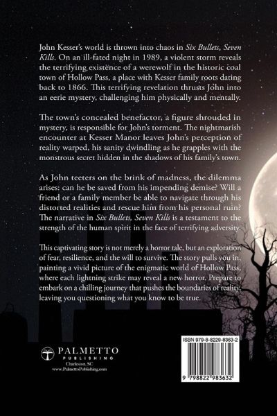 On a stormy night, a werewolf emerges, propelling John Kesser into an unpredictable mystery in Hollow Pass. Amidst trials and torment, will he survive the town's clandestine benefactor's wrath? Can loved ones restore his shattered sanity, following the terror at Kesser Manor? Six Bullets, Seven Kills is an engrossing tale of fear, fortitude, and the supernatural. This gripping narrative takes you through the perilous journey of John Kesser, a man whose life spirals into an abyss of terror and confusion on one fateful night. The quaint coal town of Hollow Pass, founded by his ancestors in 1866, is where the enigma unfolds, veiled by a monstrous secret lurking in the shadows. As the storm rages on, John is caught in the eye of the hurricane, confronted by a werewolf whose existence transcends his understanding of reality. His mind, fractured by the horrific event, struggles to comprehend the chaos enveloping him. As he navigates through this eerie world teetering on the edge of madness, he is thrust into a gruelling test of endurance, both physical and mental, manipulated by a shadowy figure-the town's secret benefactor. With his sanity hanging by a thread, and his life in peril, the question remains-can he be saved? Is there a friend who can salvage him from his impending doom? Or perhaps a family member who can penetrate his distorted perception and bring him back to reality? Six Bullets, Seven Kills is more than just a tale of horror and mystery; it is a testament to the human spirit's resilience, a chilling exploration of fear and endurance, and a riveting portrayal of how a small town's dark secret can turn one man's world upside down. This book will grip you from the first page to the last, drawing you into the enigmatic world of Hollow Pass, where every lightning strike may unveil a terrifying truth. Brace yourself for a riveting journey that will leave you questioning the limits of reality.
