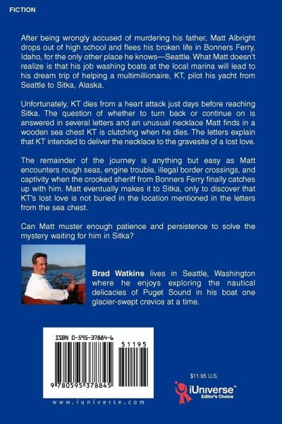 After being wrongly accused of murdering his father, Matt Albright drops out of high school and flees his broken life in Bonners Ferry, Idaho, for the only other place he knows-Seattle. What Matt doesn't realize is that his job washing boats at the local marina will lead to his dream trip of helping a multimillionaire, KT, pilot his yacht from Seattle to Sitka, Alaska. Unfortunately, KT dies from a heart attack just days before reaching Sitka. The question of whether to turn back or continue on is answered in several letters and an unusual necklace Matt finds in a wooden sea chest KT is clutching when he dies. The letters explain that KT intended to deliver the necklace to the gravesite of a lost love. The remainder of the journey is anything but easy as Matt encounters rough seas, engine trouble, illegal border crossings, and captivity when the crooked sheriff from Bonners Ferry finally catches up with him. Matt eventually makes it to Sitka, only to discover that KT's lost love is not buried in the location mentioned in the letters from the sea chest. Can Matt muster enough patience and persistence to solve the mystery waiting for him in Sitka?
