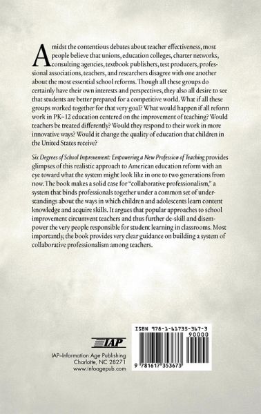 Amidst the contentious debates about teacher effectiveness, most people believe that unions, education colleges, charter networks, consulting agencies, textbook publishers, test producers, professional associations, teachers, and researchers disagree with one another about the most essential school reforms. Though all these groups do certainly have their own interests and perspectives, they also all desire to see that students are better prepared for a competitive world. What if all these groups worked together for that very goal? What would happen if all reform work in PK-12 education centered on the improvement of teaching? Would teachers be treated differently? Would they respond to their work in more innovative ways? Would it change the quality of education that children in the United States receive? Six Degrees of School Improvement: Empowering a New Profession of Teaching provides glimpses of this realistic approach to American education reform with an eye toward what the system might look like in one to two generations from now. The book makes a solid case for "collaborative professionalism," a system that binds professionals together under a common set of understandings about the ways in which children and adolescents learn content knowledge and acquire skills. It argues that popular approaches to school improvement circumvent teachers and thus further de-skill and disempower the very people responsible for student learning in classrooms. Most importantly, the book provides very clear guidance on building a system of collaborative professionalism among teachers.