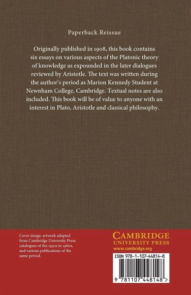 Originally published in 1908, this book contains six essays on various aspects of the Platonic theory of knowledge as expounded in the later dialogues reviewed by Aristotle. The text was written during the author's period as Marion Kennedy Student at Newnham College, Cambridge. Textual notes are also included. This book will be of value to anyone with an interest in Plato, Aristotle and classical philosophy.