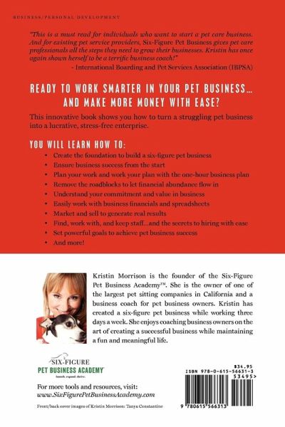 Six-Figure Pet Business is a business success book for dog trainers, dog and cat groomers, dog day care owners, and any other pet business owner. Learn how to create the foundation for success, ensure business success from the very start, remove the roadblocks to let financial success in, bow to hire the right staff members and more! This book is the roadmap for multiple six-figure success for all pet business owners who are ready to unleash their potential and grow beyond what they think is probable and explore and create what is possible!