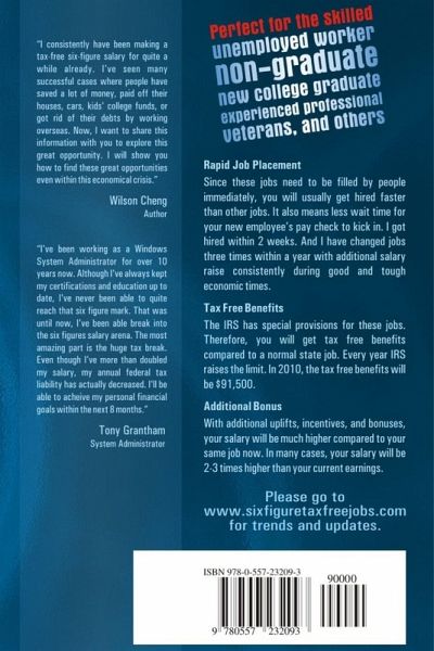 This book will show you where and how to find SIX FIGURE TAX FREE salary jobs even within this economical crisis. The author has been making TAX FREE SIX FIGURE salary for quite a while already. He wants to share this information with you to explore this great opportunity. The book will demonstrate his personal experiences, researches, salary comparisions, facts, testimonials from current employees, job search engines, and valuable companies web links. With up to date contact information for more than 170 companies actively hiring for five years and more. This book also shows you the techniques of approaching recruiters at the job fairs and gathering leads about these fast placement job opportunities. More than $90,000 tax free income exclusion annually. Perfect for skilled unemployed worker, non-graduate, experienced professional, veterans, and others. Mechanic complete package about $200K. Financial comtroller about $150K. Network Engineer about $200K and more examples. This book is a must buy.