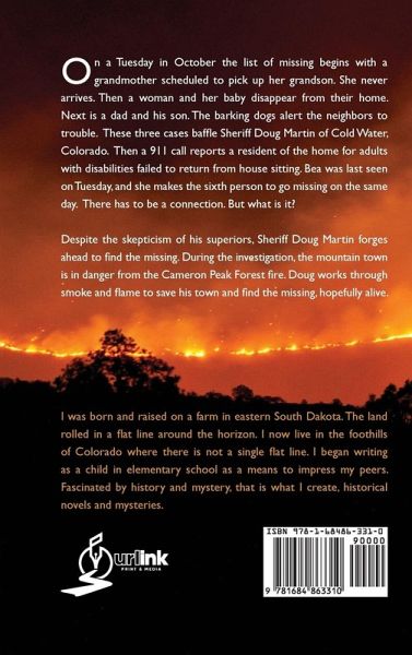 On a Tuesday in October the list of missing begins with a grandmother scheduled to pick up her grandson. She never arrives. Then a woman and her baby disappear from their home. Next is a dad and his son. The barking dogs alert the neighbors to trouble. These three cases baffle Sheriff Doug Martin of Cold Water, Colorado. Then a 911 call reports a resident of the home for adults with disabilities failed to return from house sitting. Bea was last seen on Tuesday, and she makes the sixth person to go missing on the same day. There has to be a connection. But what is it? Despite the skepticism of his superiors, Sheriff Doug Martin forges ahead to find the missing. During the investigation, the mountain town is in danger from the Cameron Peak Forest fire. Doug works through smoke and flame to save his town and find the missing, hopefully alive.