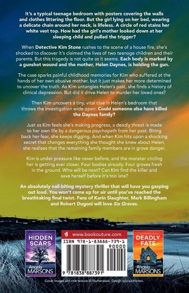 It's a typical teenage bedroom with posters covering the walls and clothes littering the floor. But the girl lying on her bed, wearing a delicate chain around her neck, is lifeless. A circle of red stains her white vest top. How had the girl's mother looked down at her sleeping child and pulled the trigger? When Detective Kim Stone rushes to the scene of a house fire, she's shocked to discover it's claimed the lives of two teenage children and their parents. But this tragedy is not quite as it seems. Each body is marked by a gunshot wound and the mother, Helen Daynes, is holding the gun. The case sparks painful childhood memories for Kim who suffered at the hands of her own abusive mother, but it just makes her more determined to uncover the truth. As Kim untangles Helen's past, she finds a history of clinical depression. But did it drive Helen to murder her loved ones? Then Kim uncovers a tiny, vital clue in Helen's bedroom that throws the investigation wide open. Could someone else have killed the Daynes family? Just as Kim feels she's making progress, a deadly threat is made to her own life by a dangerous psychopath from her past. Biting back her fear, she keeps digging. And when Kim hits upon a shocking secret that changes everything she thought she knew about Helen, she realises that the remaining family members are in grave danger. Kim is under pressure like never before, and the monster circling her is getting ever closer. Four bodies already. Four graves fresh in the ground. Who will be next? Can Kim find the killer and save herself before it's too late? An absolutely nail-biting mystery thriller that will have you gasping out loud. You won't come up for air until you've reached the breathtaking final twist. Fans of Karin Slaughter, Mark Billingham and Robert Dugoni will love Six Graves. Read what everyone is saying about the Detective Kim Stone series: 'The jack, queen, king and ace of crime fiction... you can't stop reading it until the fantastic ending... Another mesmerizing and riveting read! I find it insulting to even rate it, giving between one to five stars, because how many stars should you give to the sun?' The World Is Ours To Read, ¿¿¿¿¿ 'Superb!!! I love Kim - always have, always will!!... breathtaking, heart-pounding, exciting and thrilling!!! I completely and utterly recommend reading not just this book, but the whole series!! Fab, fab, fab, fab, fab.' Stardust Book Reviews, ¿¿¿¿¿ 'Quite simply, Angela Marsons' is THE QUEEN of Crime Fiction... Every book of Angie's is a masterpiece of storytelling.' Goodreads reviewer, ¿¿¿¿¿ 'The quality of Angela Marsons writing has never diminished over the entire series. The release of a Kim Stone novel is an event to look forward to... I wish I could give it more than 5 stars because it certainly deserves it. Excellent and I happily recommend it and the series to anyone.' Goodreads reviewer, ¿¿¿¿¿ 'The most fabulous crime series ever written.' Goodreads reviewer, ¿¿¿¿¿