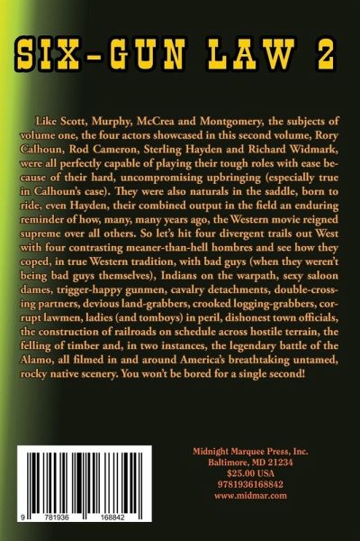 Like Scott, Murphy, McCrea and Montgomery, the subjects of volume one, the four actors showcased in this second volume, Rory Calhoun, Rod Cameron, Sterling Hayden and Richard Widmark, were all perfectly capable of playing their tough roles with ease because of their hard, uncompromising upbringing (especially true in Calhoun’s case). ey were also naturals in the saddle, born to ride, even Hayden, their combined output in the eld an enduring reminder of how, many, many years ago, the Western movie reigned supreme over all others. So let’s hit four divergent trails out West with four contrasting meaner-than-hell hombres and see how they coped, in true Western tradition, with bad guys (when they weren’t being bad guys themselves), Indians on the warpath, sexy saloon dames, trigger-happy gunmen, cavalry detachments, double-crossing partners, devious land-grabbers, crooked logging-grabbers, corrupt lawmen, ladies (and tomboys) in peril, dishonest town o cials, the construction of railroads on schedule across hostile terrain, the felling of timber and, in two instances, the legendary battle of the Alamo, all lmed in and around America’s breathtaking untamed, rocky native scenery. You won’t be bored for a single second!