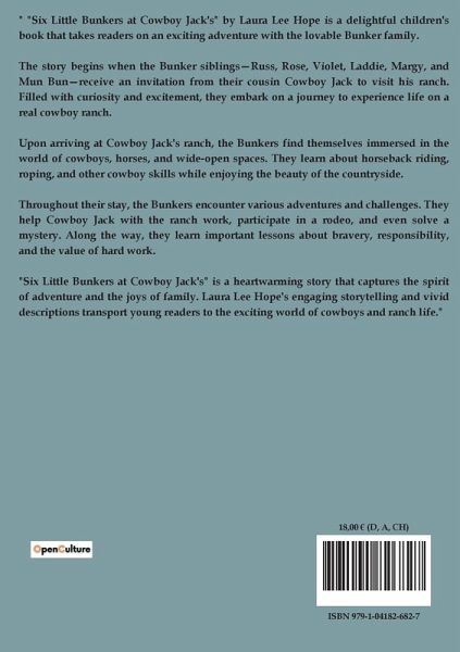 " "Six Little Bunkers at Cowboy Jack's" by Laura Lee Hope is a delightful children's book that takes readers on an exciting adventure with the lovable Bunker family. The story begins when the Bunker siblings¿Russ, Rose, Violet, Laddie, Margy, and Mun Bun¿receive an invitation from their cousin Cowboy Jack to visit his ranch. Filled with curiosity and excitement, they embark on a journey to experience life on a real cowboy ranch. Upon arriving at Cowboy Jack's ranch, the Bunkers find themselves immersed in the world of cowboys, horses, and wide-open spaces. They learn about horseback riding, roping, and other cowboy skills while enjoying the beauty of the countryside. Throughout their stay, the Bunkers encounter various adventures and challenges. They help Cowboy Jack with the ranch work, participate in a rodeo, and even solve a mystery. Along the way, they learn important lessons about bravery, responsibility, and the value of hard work. "Six Little Bunkers at Cowboy Jack's" is a heartwarming story that captures the spirit of adventure and the joys of family. Laura Lee Hope's engaging storytelling and vivid descriptions transport young readers to the exciting world of cowboys and ranch life."