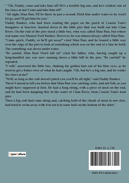 " "Oh, Daddy, come and take him off! He's a terrible big one, and he's winkin' one of his claws at me! Come and take him off!" "All right, Mun Bun. I'll be there in just a second. Hold him under water so he won't let go, and I'll get him for you." Daddy Bunker, who had been reading the paper on the porch of Cousin Tom's bungalow at Seaview, hurried down to the little pier that was built out into Clam River. On the end of the pier stood a little boy, who was called Mun Bun, but whose real name was Munroe Ford Bunker. However, he was almost always called Mun Bun. "Come quick, Daddy, or he'll get away!" cried Mun Bun, and he leaned a little way over the edge of the pier to look at something which was on the end of a line he held. The something was down under water. "Be careful, Mun Bun! Don't fall in!" cried his father, who, having caught up a long-handled net, was now running down a little hill to the pier. "Be careful!" he repeated. "I will," answered the little boy, shaking his golden hair out of his blue eyes, as he tried to get a better view of what he had caught. "Oh, but he's a big one, and he winks his claws at me!" "Well, as long as the crab doesn't pinch you you'll be all right," said Daddy Bunker. There! I meant to tell you before that Mun Bun was catching crabs, and not fish, as you might have supposed at first. He had a long string, with a piece of meat on the end, and he had been dangling this in the water of Clam River, from Cousin Tom's boat pier. Then a big crab had come along and, catching hold of the chunk of meat in one claw, had tried to swim away with it to eat it in some hole on the bottom of the inlet."