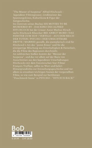 "The Master of Suspense" Alfred Hitchcock - legendärer Filmregisseur, Großmeister des Spannungskinos, Kulturikone & Figur der Zeitgeschichte.Ins Zentrum seines Buches "Six Movies To Be Murdered By - Das Kino des Alfred Hitchcock" hat der Grazer Autor Markus Hirsch sechs Hitchcock-Klassiker (Bei Anruf Mord / Das Fenster zum Hof / Vertigo - Aus dem Reich der Toten / Psycho / Der unsichtbare Dritte / Marnie) gestellt, die exemplarisch sind für Hitchcock's Art des "puren Kinos" und für die einzigartige Mischung aus Ernsthaftigkeit & Heiterkeit, die die Filme des Regisseurs durchzieht. An zahlreichen Stellen kommt der "Meister der Suspense", und das vor allem auf der Basis von Ausschnitten aus den legendären Unterhaltungen Hitchcocks mit dem französischen Star-Filmer François Truffaut, selbst zu Wort und liefert Hintergrundinfos zur Entstehungsgeschichte und vor allem zu einzelnen wichtigen Szenen der vorgestellten Filme, so wie zum Beispiel zur berühmten "Duschmord-Szene" in Psycho -"Hitch is back!"