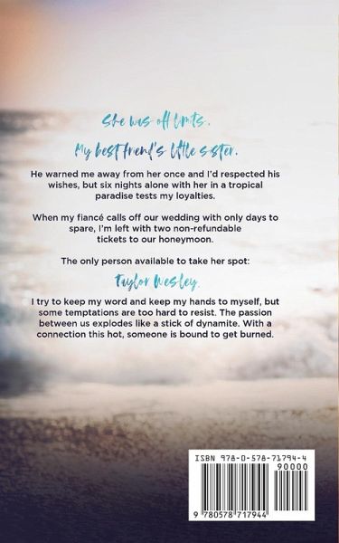 She was off limits. My best friend's little sister. He warned me away from her once and I'd respected his wishes, but six nights alone with her in a tropical paradise tests my loyalties. When my fiancé calls off our wedding with only days to spare, I'm left with two non-refundable tickets to our honeymoon. The only person available to take her spot: Taylor Wesley. I try to keep my word and keep my hands to myself, but some temptations are too hard to resist. The passion between us explodes like a stick of dynamite. With a connection this hot, someone is bound to get burned. Six Nights in Paradise is a standalone, brother's best friend romance.