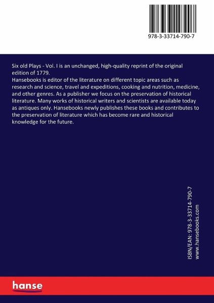 Six old Plays - Vol. I is an unchanged, high-quality reprint of the original edition of 1779.Hansebooks is editor of the literature on different topic areas such as research and science, travel and expeditions, cooking and nutrition, medicine, and other genres. As a publisher we focus on the preservation of historical literature. Many works of historical writers and scientists are available today as antiques only. Hansebooks newly publishes these books and contributes to the preservation of literature which has become rare and historical knowledge for the future.