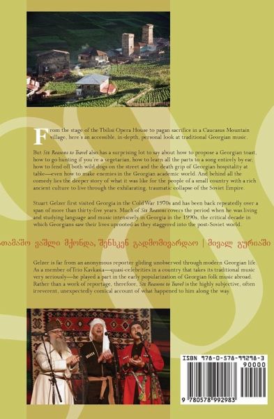 From the stage of the Tbilisi Opera House to pagan sacrifice in a Caucasus Mountain village, here's an accessible, in-depth, personal look at traditional Georgian music. But Six Reasons to Travel also has a surprising lot to say about how to propose a Georgian toast, how to go hunting if you're a vegetarian, how to learn all the parts to a song entirely by ear, how to fend off both wild dogs on the street and the death grip of Georgian hospitality at table-even how to make enemies in the Georgian academic world. And behind all the comedy lies the deeper story of what it was like for the people of a small country with a rich ancient culture to live through the exhilarating, traumatic collapse of the Soviet Empire. Stuart Gelzer first visited Georgia in the Cold War 1970s and has been back repeatedly over a span of more than thirty-five years. Much of Six Reasons covers the period when he was living and studying language and music intensively in Georgia in the 1990s, the critical decade in which Georgians saw their lives uprooted as they staggered into the post-Soviet world. Gelzer is far from an anonymous reporter gliding unobserved through modern Georgian life. As a member of Trio Kavkasia-quasi-celebrities in a country that takes its traditional music very seriously-he played a part in the early popularization of Georgian folk music abroad. Rather than a work of reportage, therefore, Six Reasons to Travel is the highly subjective, often irreverent, unexpectedly comical account of what happened to him along the way.