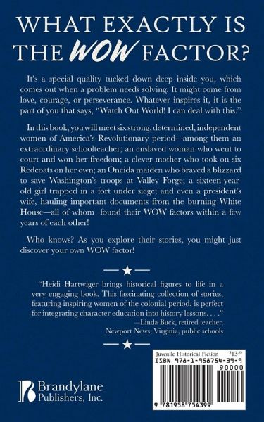 WHAT EXACTLY IS THE WOW FACTOR? It's a special quality tucked down deep inside you, which comes out when a problem needs solving. It might come from love, courage, or perseverance. Whatever inspires it, it is the part of you that says, "Watch Out World! I can deal with this." In this book, you will meet six strong, determined, independent women of America's Revolutionary period-among them an extraordinary schoolteacher; an enslaved woman who went to court and won her freedom; a clever mother who took on six Redcoats on her own; an Oneida maiden who braved a blizzard to save Washington's troops at Valley Forge; a sixteen-year- old girl trapped in a fort under siege; and even a president's wife, hauling important documents from the burning White House-all of whom found their WOW factors within a few years of each other! Who knows? As you explore their stories, you might just discover your own WOW factor!
