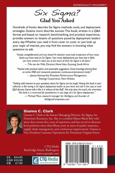Hundreds of books describe Six Sigma methods, tools, and deployment strategies. Dozens more describe success. This book, written in a Q&A format and based on research, benchmarking, and practical experience, provides answers to dozens of questions posed by deployment leaders every day. Whether you read it from cover to cover or just look up your topic of interest, you may find the answers in knowing what questions to ask. Gianna C. Clark is the former Managing Director, Six Sigma, for Dominion Resources, Inc. She is a certified Master Black Belt with more than twenty-five years of experience, and has served in director-level positions more than fifteen years in areas of quality assurance, supply chain management, and continuous improvement. Gianna is Vice President Customer Operations for Dominion Virginia Power.