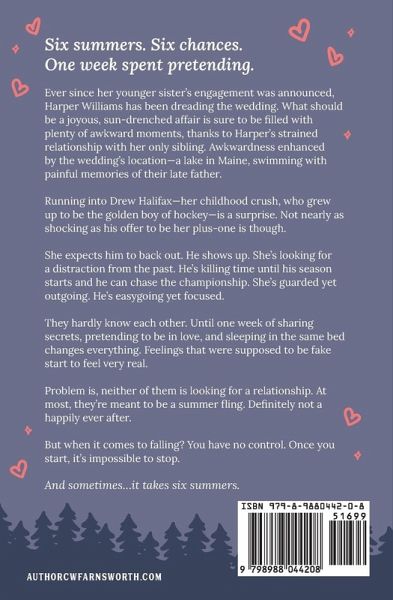 Six summers. Six chances. One week spent pretending. Ever since her younger sister's engagement was announced, Harper Williams has been dreading the wedding. What should be a joyous, sun-drenched affair is sure to be filled with plenty of awkward moments, thanks to Harper's strained relationship with her only sibling. Awkwardness enhanced by the wedding's location-a lake in Maine, swimming with painful memories of their late father. Running into Drew Halifax-her childhood crush, who grew up to be the golden boy of hockey-is a surprise. Not nearly as shocking as his offer to be her plus-one is though. She expects him to back out. He shows up. She's looking for a distraction from the past. He's killing time until his season starts and he can chase the championship. She's guarded yet outgoing. He's easygoing yet focused. They hardly know each other. Until one week of sharing secrets, pretending to be in love, and sleeping in the same bed changes everything. Feelings that were supposed to be fake start to feel very real. Problem is, neither of them is looking for a relationship. At most, they're meant to be a summer fling. Definitely not a happily ever after. But when it comes to falling? You have no control. Once you start, it's impossible to stop. And sometimes...it takes six summers.