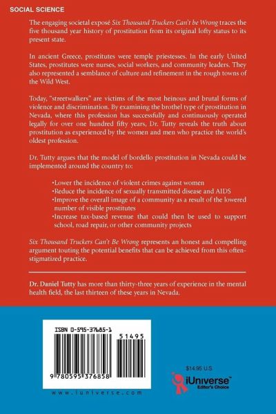 The engaging societal exposé Six Thousand Truckers Can't be Wrong traces the five thousand year history of prostitution from its original lofty status to its present state. In ancient Greece, prostitutes were temple priestesses. In the early United States, prostitutes were nurses, social workers, and community leaders. They also represented a semblance of culture and refinement in the rough towns of the Wild West. Today, 'streetwalkers" are victims of the most heinous and brutal forms of violence and discrimination. By examining the brothel type of prostitution in Nevada, where this profession has successfully and continuously operated legally for over one hundred fifty years, Dr. Tutty reveals the truth about prostitution as experienced by the women and men who practice the world's oldest profession. Dr. Tutty argues that the model of bordello prostitution in Nevada could be implemented around the country to: Lower the incidence of violent crimes against women Reduce the incidence of sexually transmitted disease and AIDS Improve the overall image of a community as a result of the lowered number of visible prostitutes Increase tax-based revenue that could then be used to support school, road repair, or other community projects Six Thousand Truckers Can't Be Wrong represents an honest and compelling argument touting the potential benefits that can be achieved from this often-stigmatized practice.