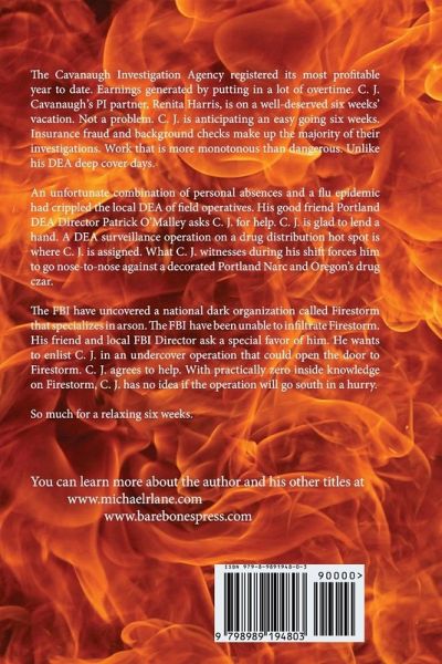 The Cavanaugh Investigation Agency registered its most profitable year to date. Earnings generated by putting in a lot of overtime. C. J. Cavanaugh's PI partner, Renita Harris, is on a well-deserved six weeks' vacation. Not a problem. C. J. is anticipating an easy going six weeks. Insurance fraud and background checks make up the majority of their investigations. Work that is more monotonous than dangerous. Unlike his DEA deep cover days. An unfortunate combination of personal absences and a flu epidemic had crippled the local DEA of field operatives. His good friend Portland DEA Director Patrick O'Malley asks C. J. for help. C. J. is glad to lend a hand. A DEA surveillance operation on a drug distribution hot spot is where C. J. is assigned. What C. J. witnesses during his shift forces him to go nose-to-nose against a decorated Portland Narc and Oregon's drug czar. The FBI have uncovered a national dark organization called Firestorm that specializes in arson. The FBI have been unable to infiltrate Firestorm. His friend and local FBI Director ask a special favor of him. He wants to enlist C. J. in an undercover operation that could open the door to Firestorm. C. J. agrees to help. With practically zero inside knowledge on Firestorm, C. J. has no idea if the operation will go south in a hurry. So much for a relaxing six weeks.
